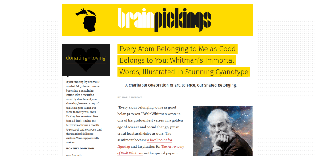 Brain Pickings was created and is written by Maria Popova. From her About page she writes “I am a reader and writer, and I write about what I read here on Brain Pickings — my one-woman labor of love. It is an inquiry into what it means to live a decent, substantive, rewarding life, and a record of my own becoming as a person — intellectually, creatively, spiritually — drawn from my extended marginalia on the search for meaning across literature, science, art, philosophy, and the various other tentacles of human thought and feeling.” I have been a subscriber to her newsletter for several years now, and it is a weekly highlight to read. Some articles focus on a single theme in depth, while other post’s can meander and skim on multiple subjects. Well worth checking out.