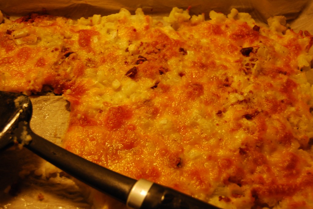 Cut the cauliflower into florets and boil or steam until tender. Coat a baking sheet with avocado oil then spread on the cauliflower and gently smash it down. Top with bacon, onions and cheese and bake at 425 degrees for 10-12 minutes.