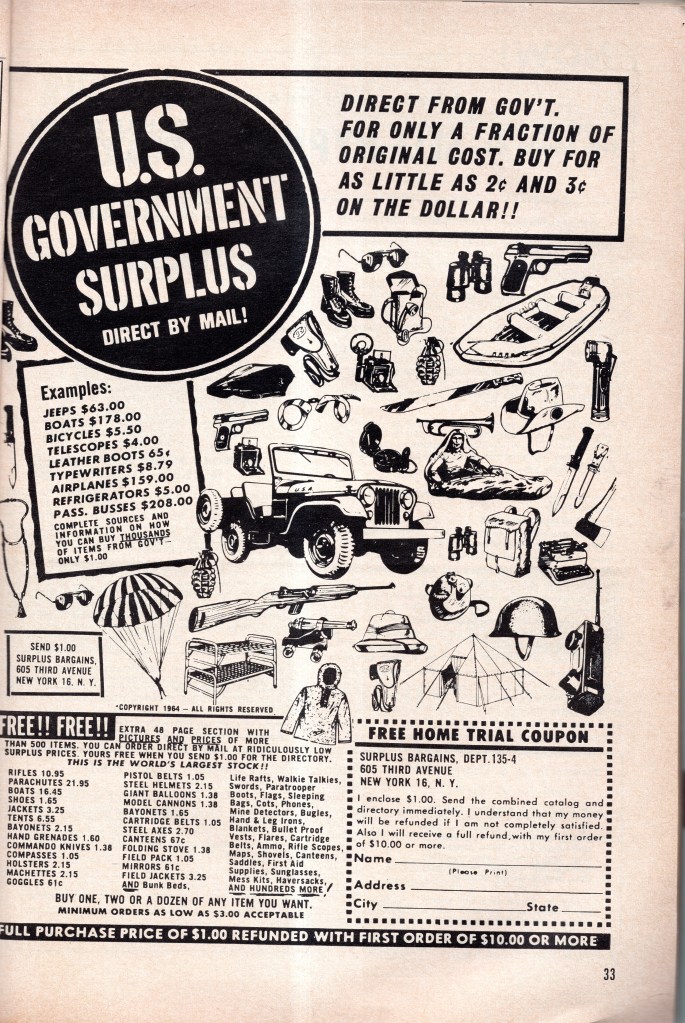 These ads were seemingly everywhere when one would pick up a magazine or comic book during the mid-20th century. I learned my lesson the one (and only) time I sent off for one of these catalogs. You received advice for your $1, such as “visit an army surplus store”, or “ask if the owners are willing to bargain.” I would imagine most people were too embarrassed at being so gullible to ask for a refund. I remember I was.
