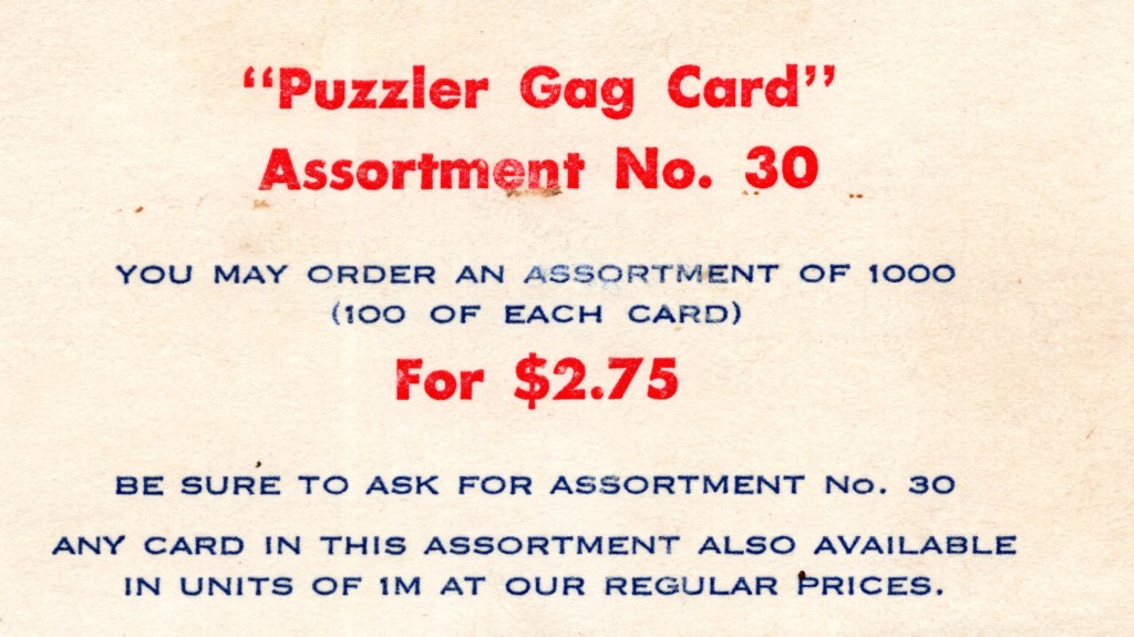 I came across a small box of these “Puzzler Gag Cards” a few months ago and decided to fit them into this blog from time to time.